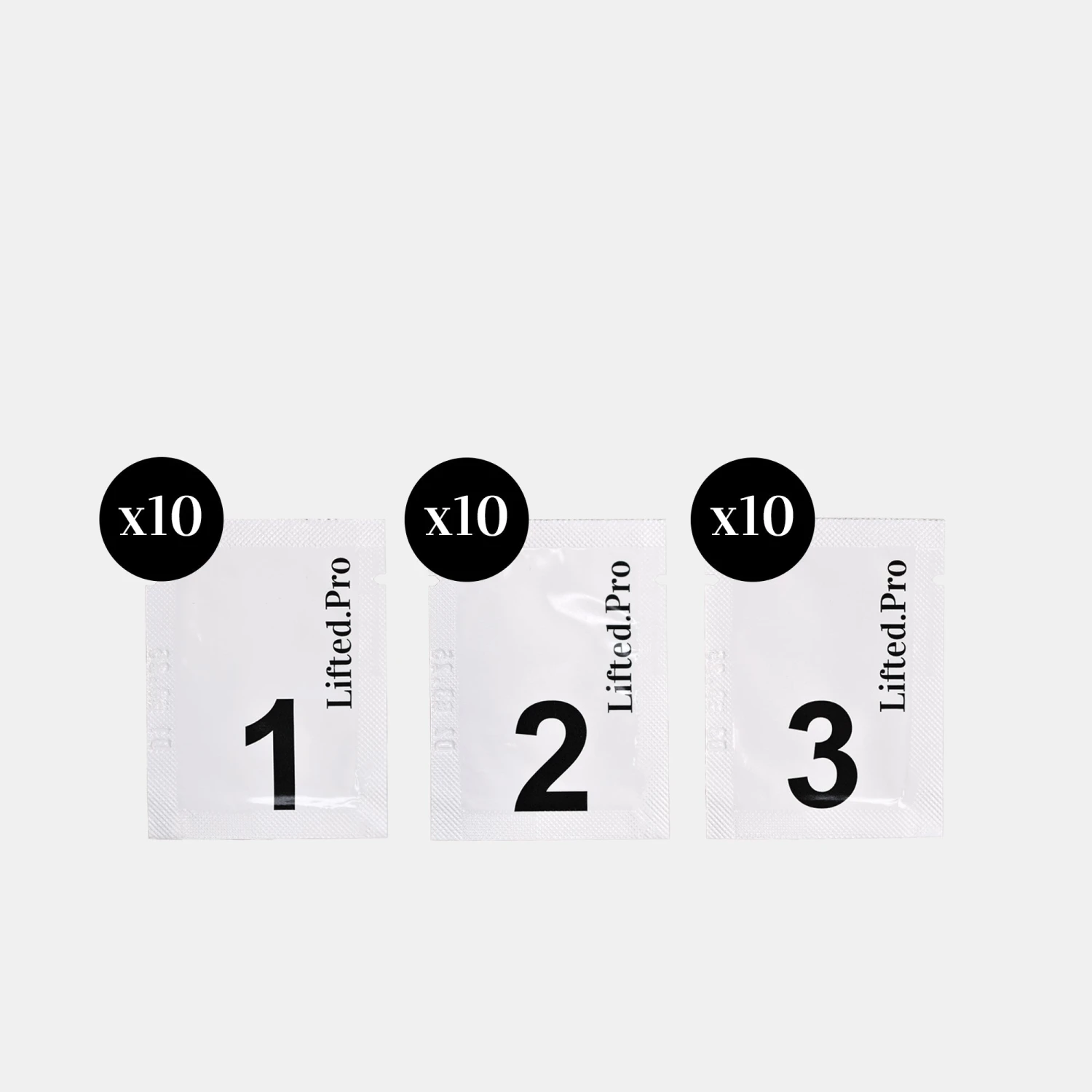 This pack contains 10 sachets of each step 1, 2 and 3 of Lifted. Pro. Each sachet can be used for up to 3 treatments (30 treatments per pack).